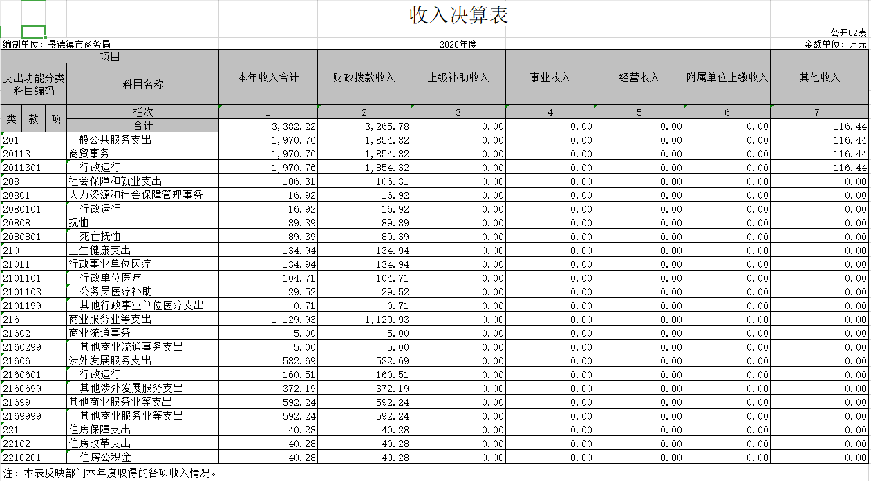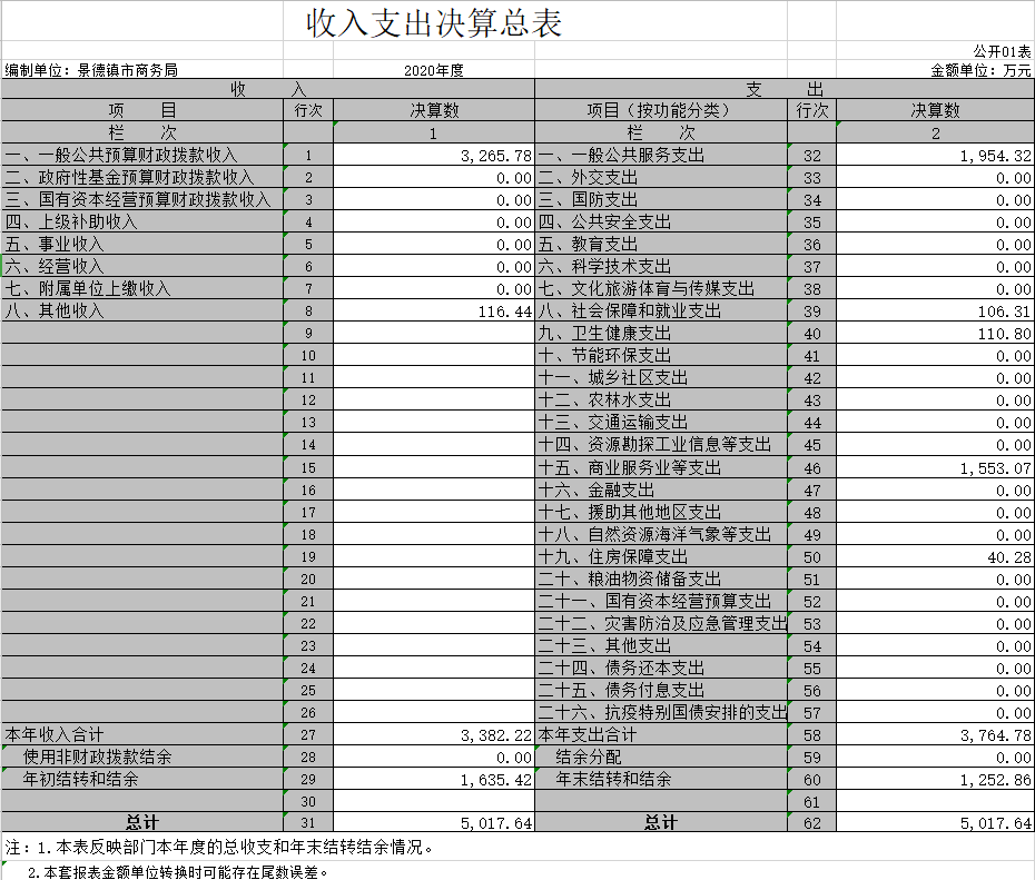 本部门2020年度收入总计 5017.64 万元,其中年初结转和结余 1635.42 万元,较2019年增加927.62 万元,增长22.68 %;本年收入合计 3382.22万元,较2019年减少72.92万元,下降2.12 %,主要原因是:市政府拨开放型专项资金的减少。