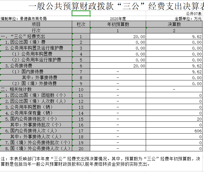 本部门2020年度一般公共预算财政拨款“三公”经费支出年初预算数为 20 万元,决算数为9.62 万元,完成预算的 48.10 %,决算数较2019年增加2.58 万元,增长36.64 %,其中: