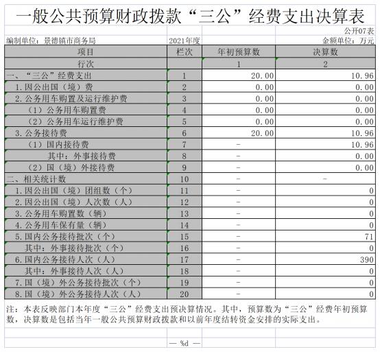 (二)公务接待费支出年初预算数为 20 万元,决算数为10.96 万元, 完成预算的 54.8%,决算数较 2020 年增加 1.34 万元, 增长 12.23%,主要原因是 2021 年瓷博会由商务局牵头成立筹备指挥部, 指挥部办公室设在市商务局。单位接待人员相对增加,公务接待费与同期对比增加 1.34 万元。全年国内公务接待71 批,累计接待 390 人次。
