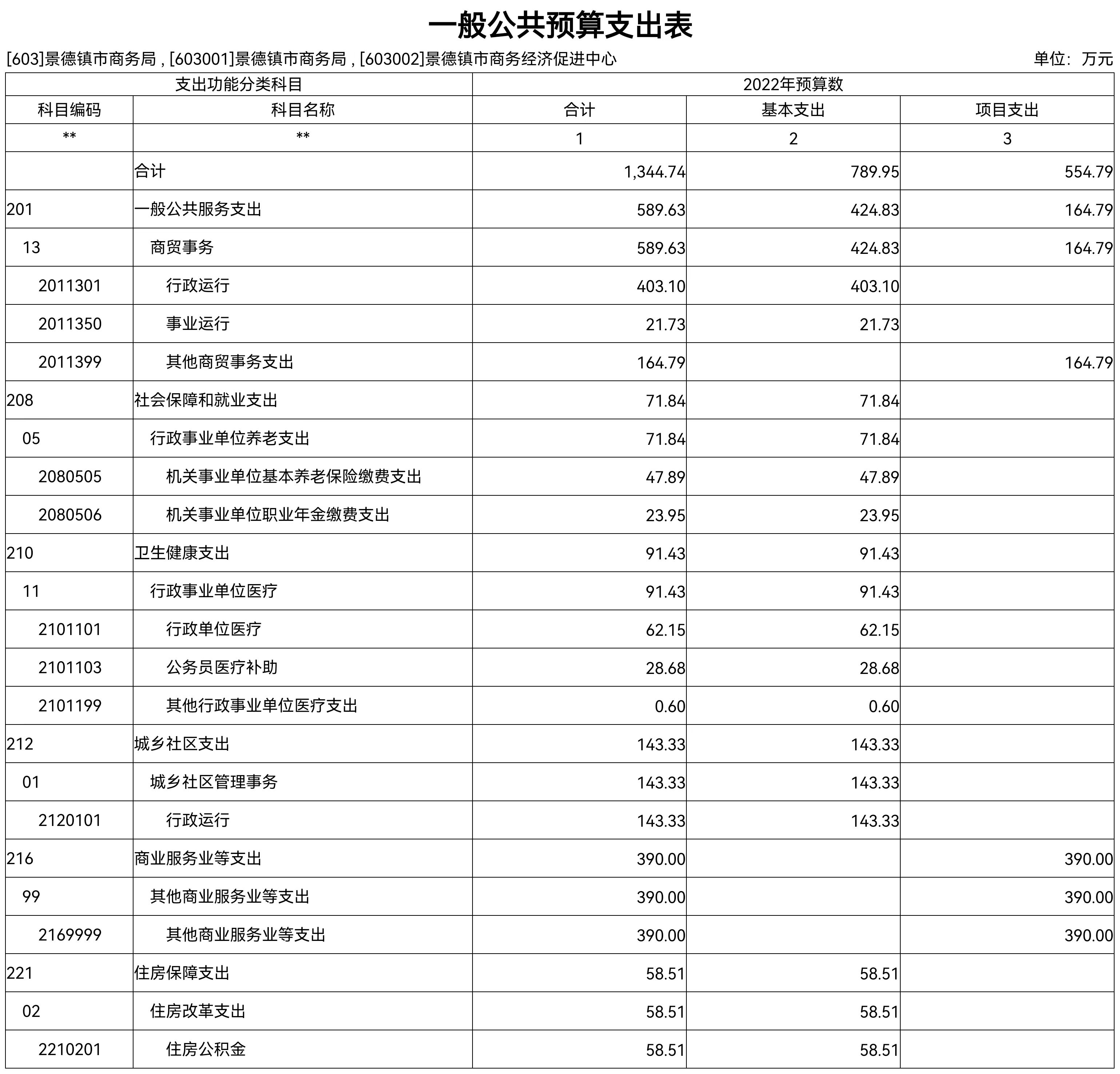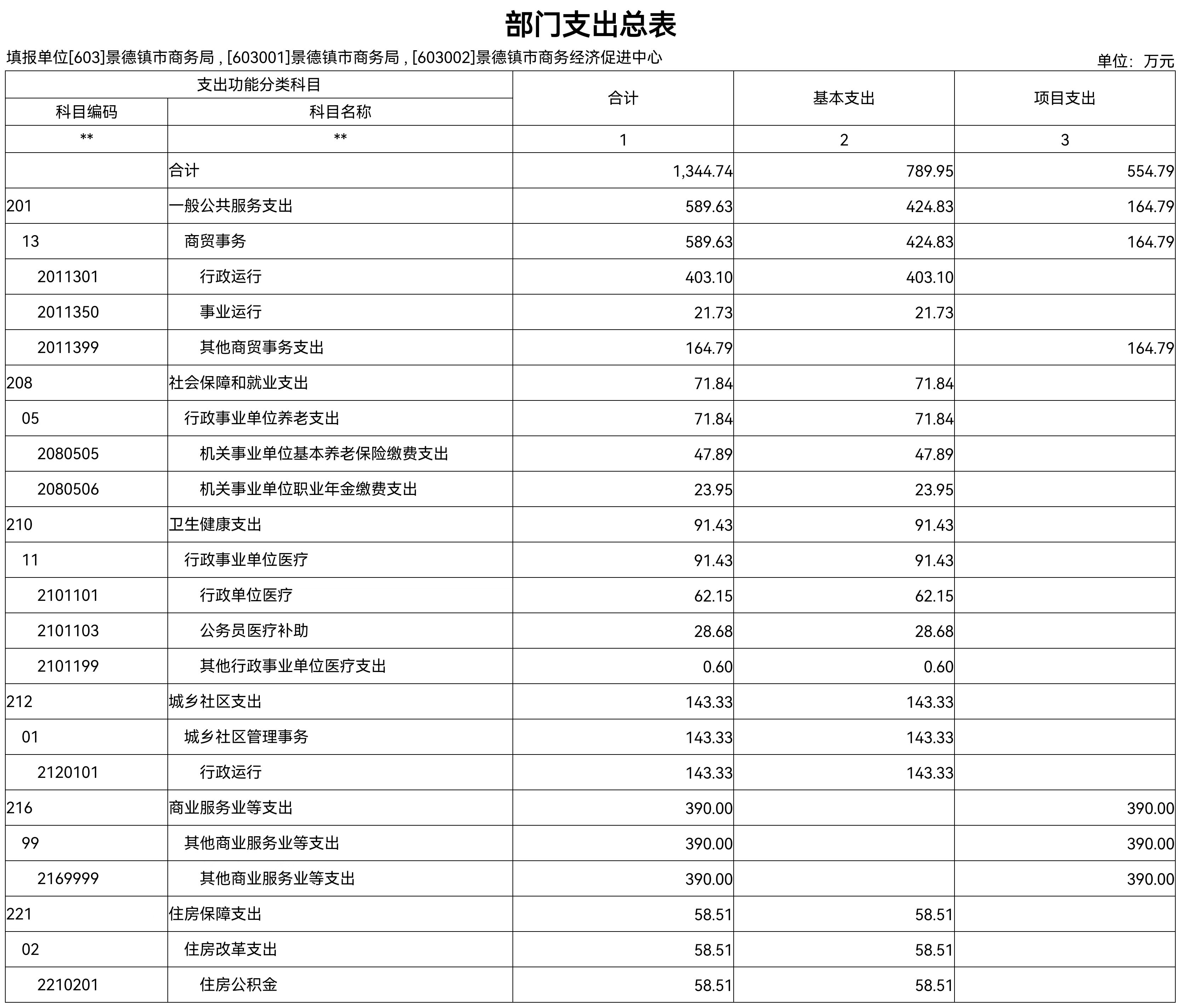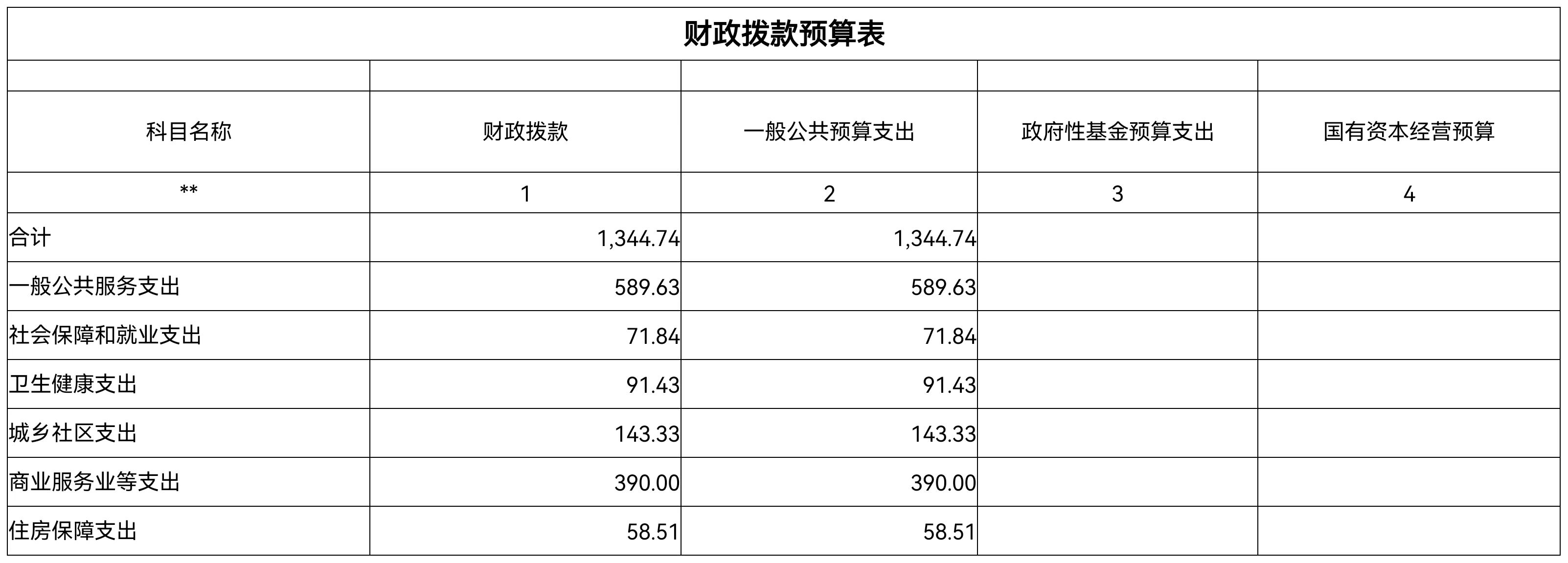 按支出功能科目划分:一般公共服务支出589.63万元,社会保障和就业支出71.84万元,卫生健康支出91.43万元,住房保障支出58.51万元。