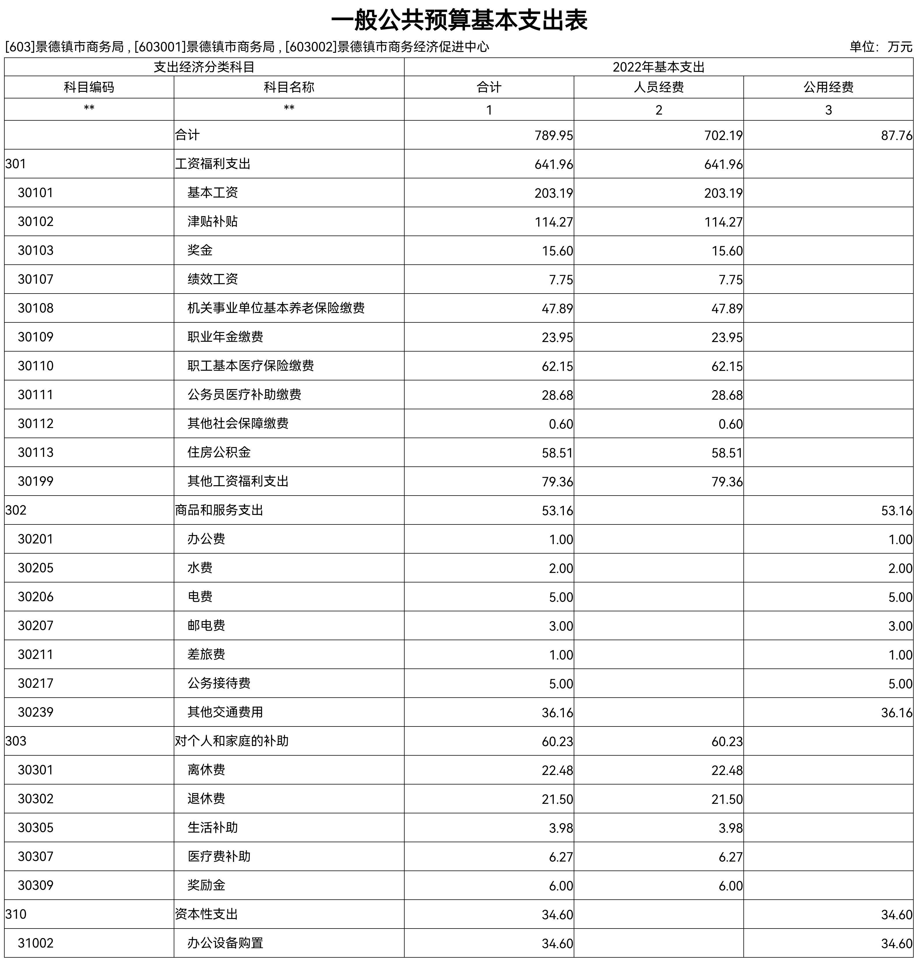 按支出项目类别划分:基本支出789.95万元,较上年预算安排增加减少451.91万元;其中:工资福利支出641.96万元,商品和服务支出53.16万元,对个人和家庭的补助60.23万元,资本性支出34.60万元。