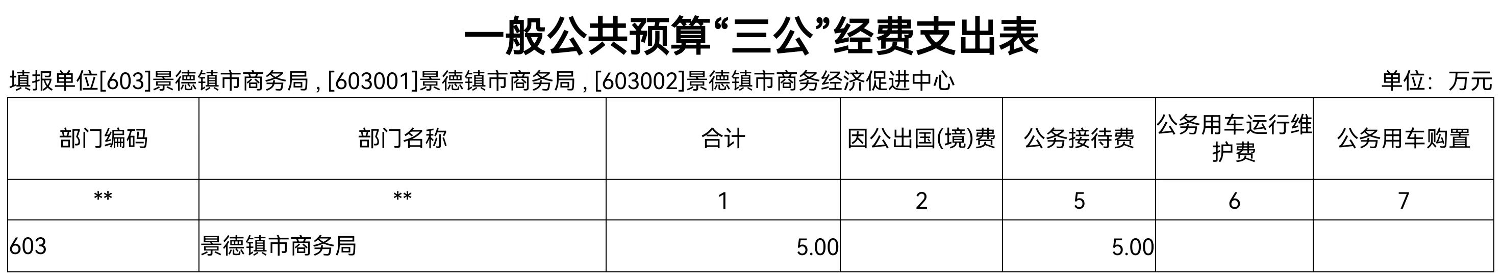 2022年景德镇市商务局"三公"经费一般公共预算安排5万元,比上年减少15万元,其中: