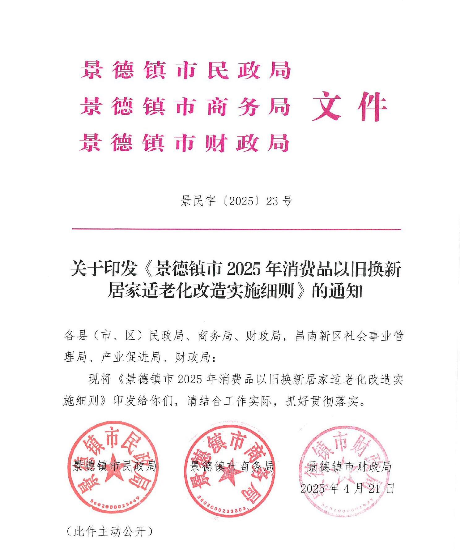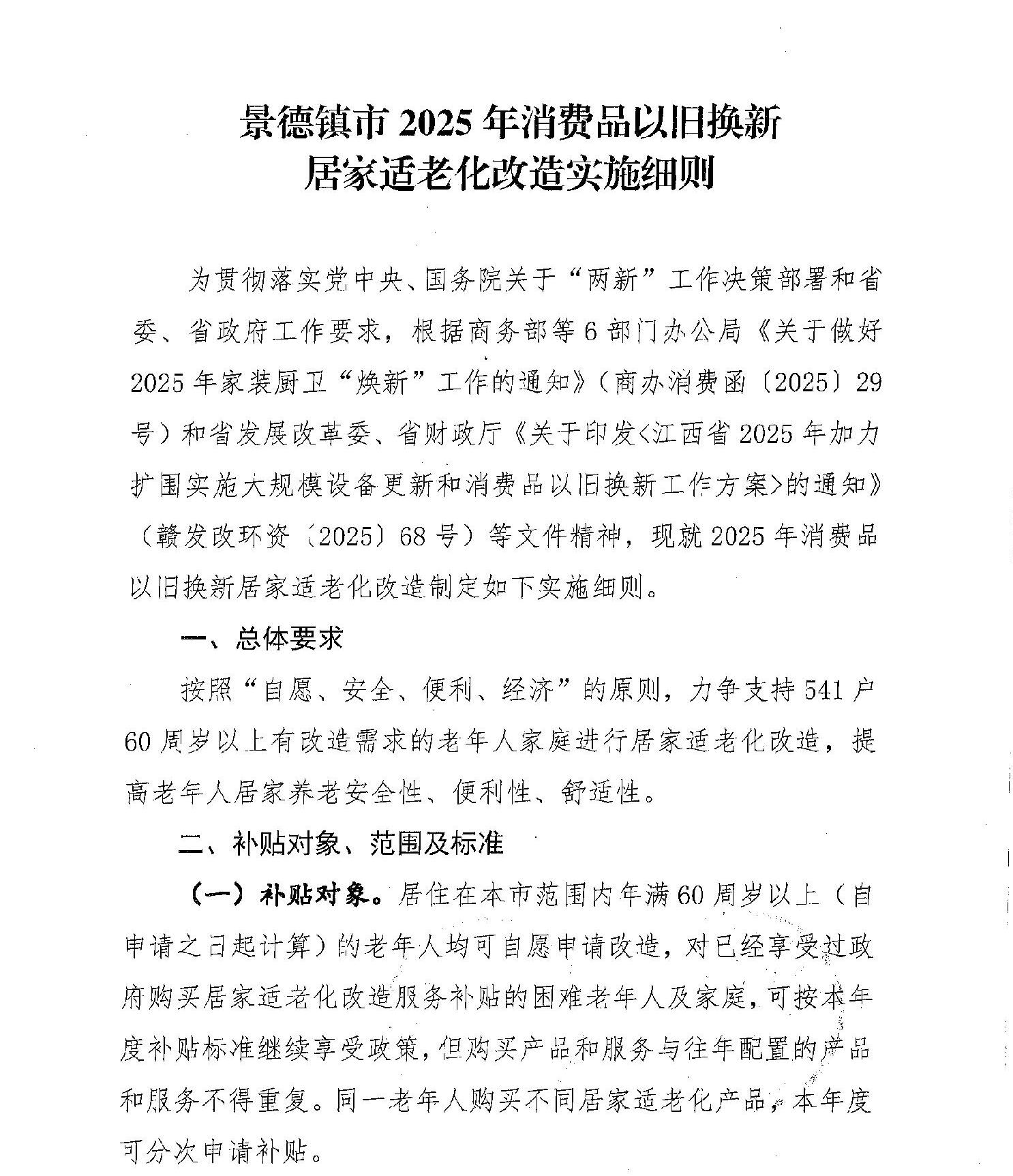 关于印发《景德镇市2025年消费品以旧换新居家适老化改造实施细则》的通知