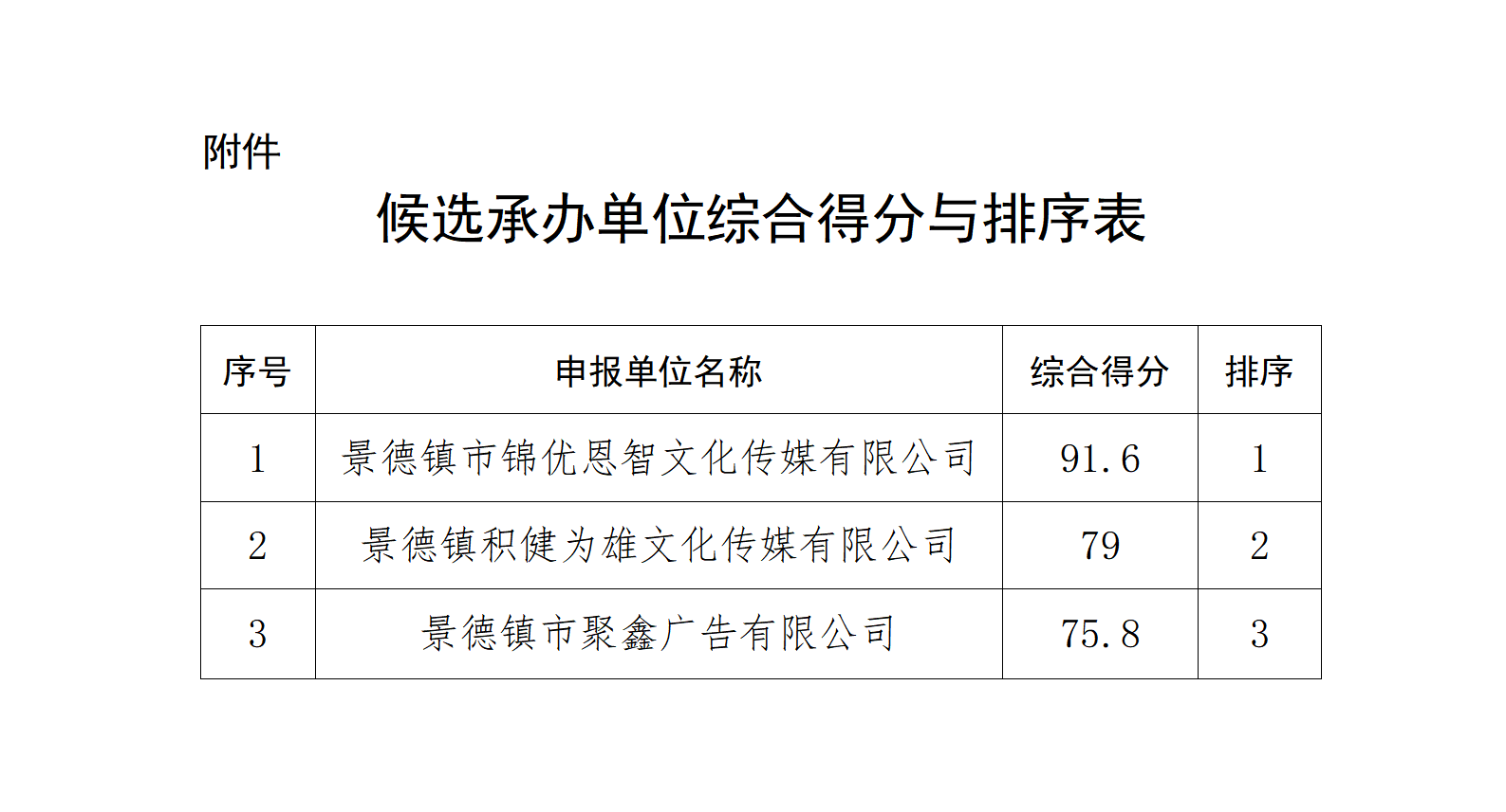 经评审小组集体研究与最终确认,景德镇市锦优恩智文化传媒有限公司在各评审维度中表现突出,综合得分最高,具备承接本次活动服务的实力与条件,现确定该公司为2025瓷博会重点产业招商大会专题招商活动的服务承办单位。