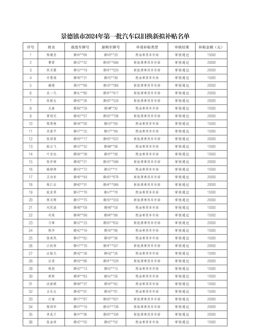 附件:景德镇市2024年第一批汽车以旧换新拟补贴名单