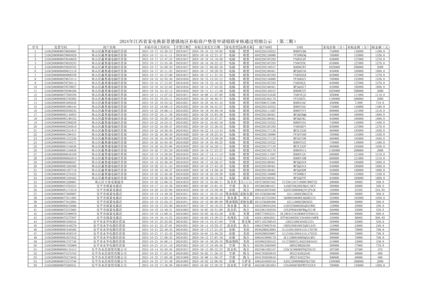 根据2024年江西省家电换新补贴活动工作安排和有关协议约定,省级服务平台中国银联股份有限公司江西分公司对我市参与江西省家电换新活动的商户提交的补贴申领材料进行了审核,并聘请第三方审计机构进行了初核。第二期经银联审核通过的商户垫资申请共计992笔,家电销售金额补贴金额821073.99元。