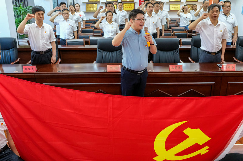 升旗仪式结束后,紧接着开展了“重温入党誓词”活动。在家的38名中国共产党党员在局党组书记、局长沈昆的带领下,面对鲜红的党旗,高举右手,庄严宣誓,表达了永远跟党走,为党和人民事业奋斗终身的坚定理想和追求。