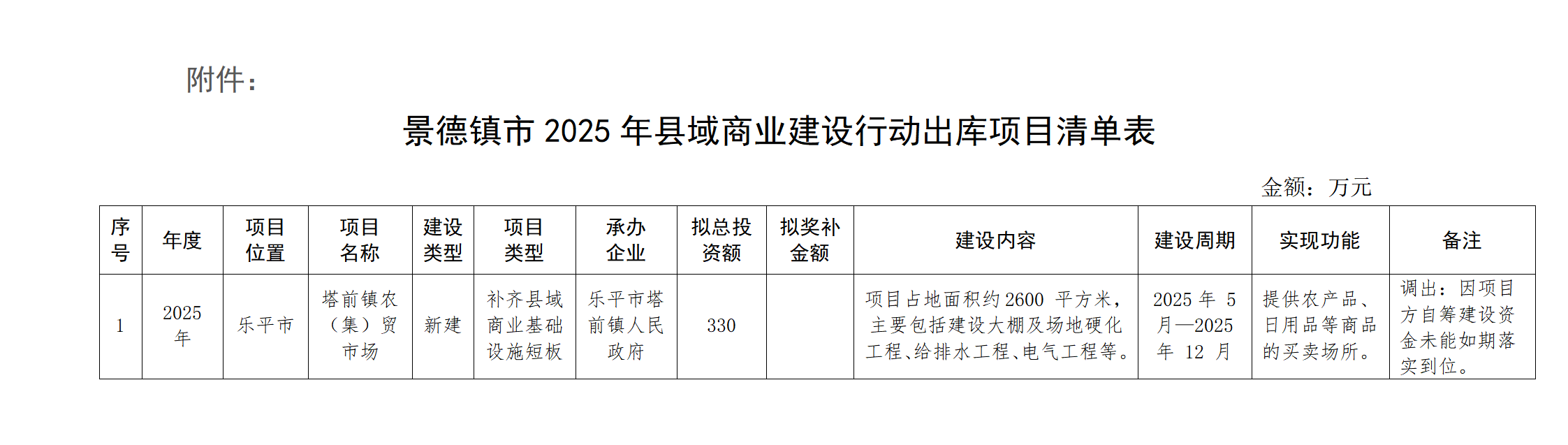 1.项目调出。乐平市塔前镇农(集)贸市场项目,因项目建设资金至今未落实到位,经属地乡镇政府申请、乐平市商务局研究并履行报备程序,现决定将该项目调出江西省2025年县域商业建设储备项目库(详见附件)。